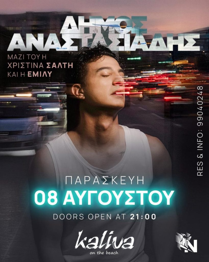 Ο Δήμος Αναστασιάδης έρχεται για μια μοναδική καλοκαιρινή εμφάνιση στο Kaliva on the Beach, την Παρασκευή 8 Αυγούστου, σε μια βραδιά γεμάτη συναίσθημα, ρυθμό και αγαπημένες επιτυχίες.