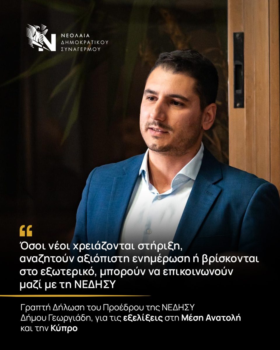 Γραπτή Δήλωση του Προέδρου της ΝΕΔΗΣΥ, Δήμου Γεωργιάδη, για τις εξελίξεις στη Μέση Ανατολή και την Κύπρο.