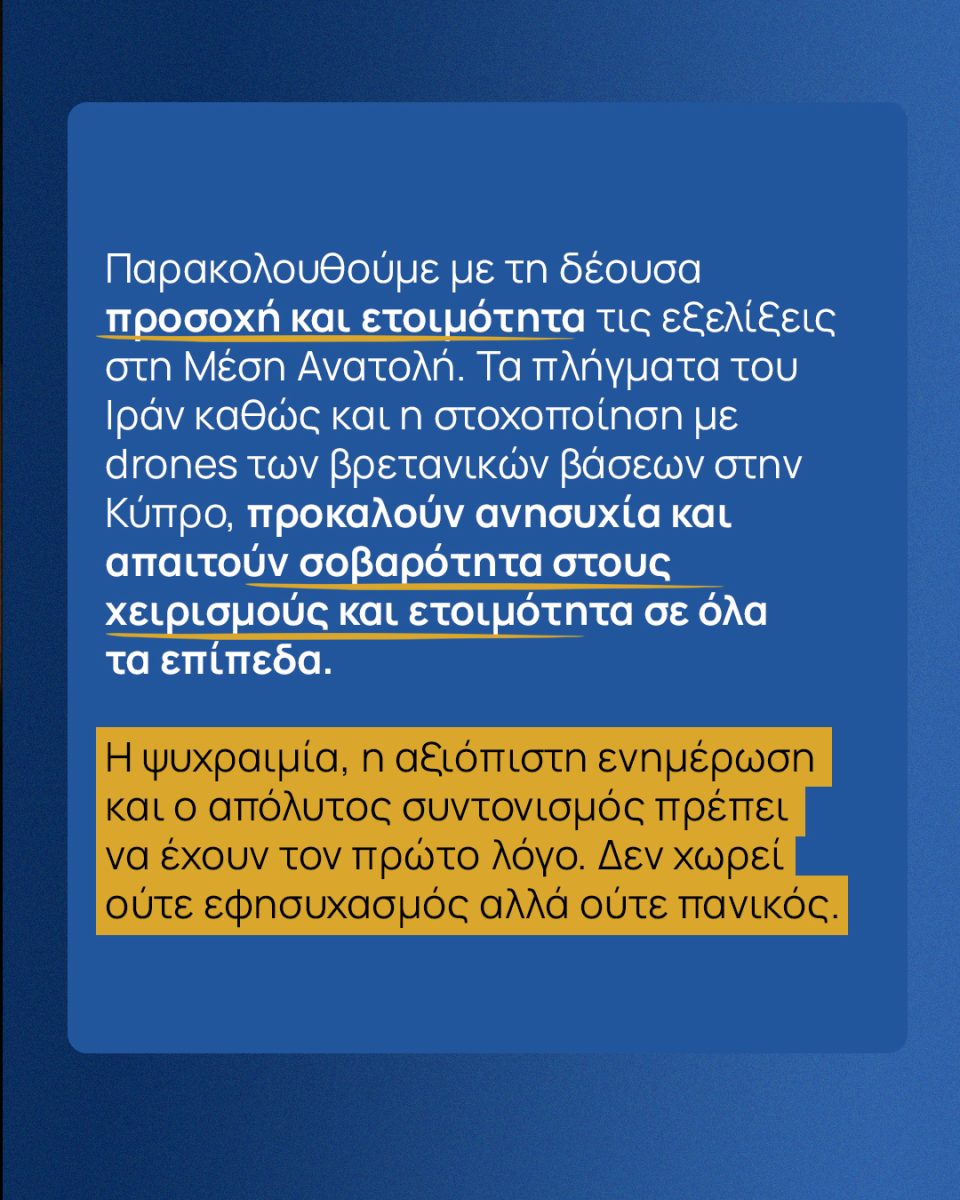 Παρακολουθούμε με τη δέουσα προσοχή και ετοιμότητα τις εξελίξεις στη Μέση Ανατολή. Τα πλήγματα του Ιράν καθώς και η στοχοποίηση με drones των βρετανικών βάσεων στην Κύπρο, προκαλούν ανησυχία και απαιτούν σοβαρότητα στους χειρισμούς και ετοιμότητα σε όλα τα επίπεδα.
