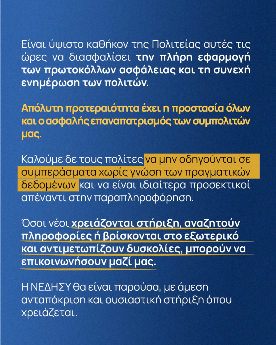 Είναι ύψιστο καθήκον της Πολιτείας αυτές τις ώρες να διασφαλίσει την πλήρη εφαρμογή των πρωτοκόλλων ασφάλειας και τη συνεχή ενημέρωση των πολιτών. Απόλυτη προτεραιότητα έχει η προστασία όλων και ο ασφαλής επαναπατρισμός των συμπολιτών μας.