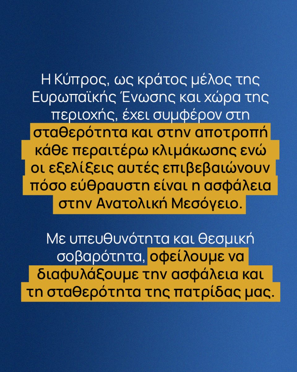 Η Κύπρος, ως κράτος μέλος της Ευρωπαϊκής Ένωσης και χώρα της περιοχής, έχει συμφέρον στη σταθερότητα και στην αποτροπή κάθε περαιτέρω κλιμάκωσης ενώ οι εξελίξεις αυτές επιβεβαιώνουν πόσο εύθραυστη είναι η ασφάλεια στην Ανατολική Μεσόγειο. Με υπευθυνότητα και θεσμική σοβαρότητα, οφείλουμε να διαφυλάξουμε την ασφάλεια και τη σταθερότητα της πατρίδας μας.